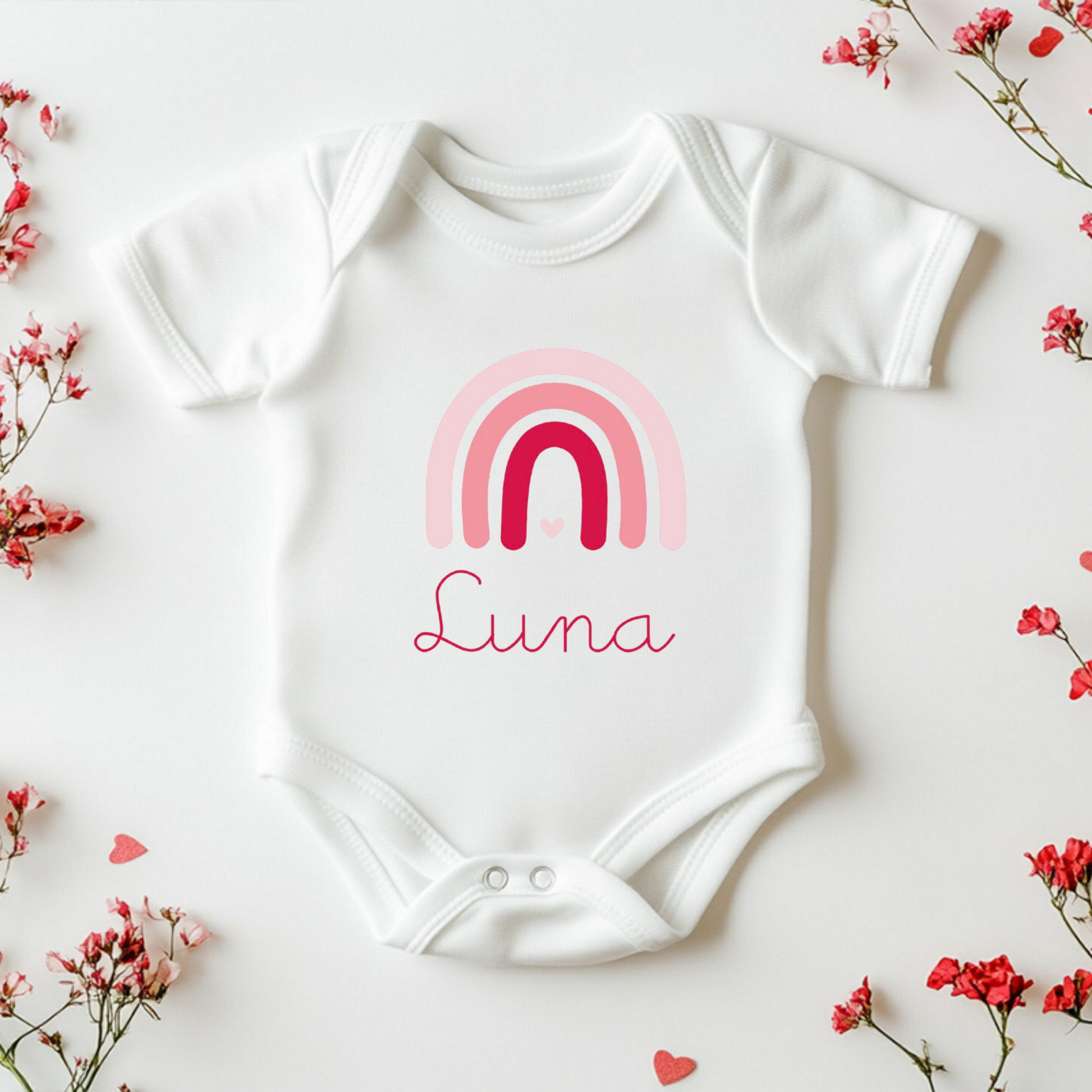Body super suavecito de manga corta con estampado de un pequeño arcoíris en tonos rosas.
